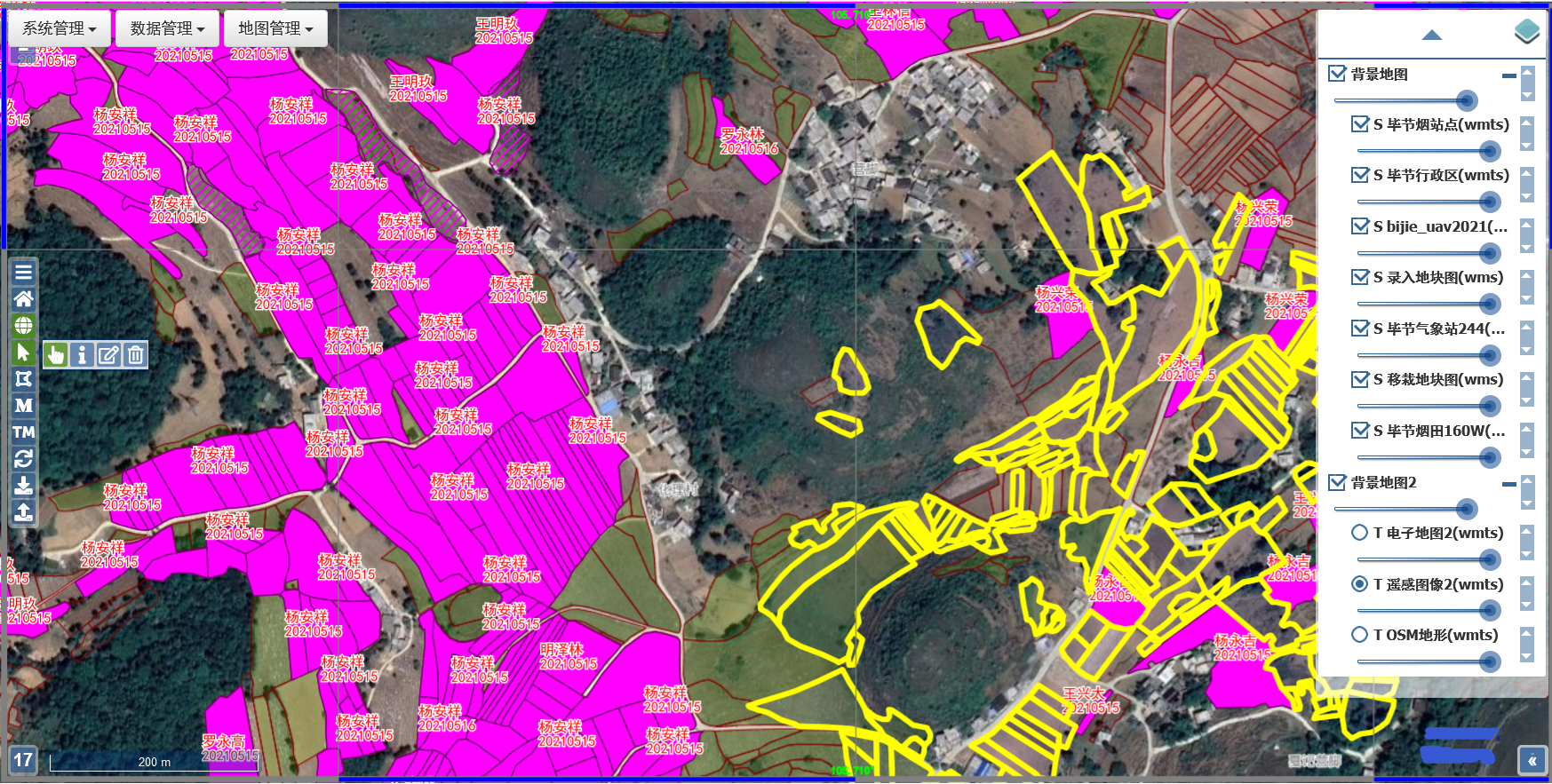 业务运行系统功能:(1)毕节地区烟田的种植规划、移栽核查和长势监测;(2)基本保护烟田的调查制图和统计。该GIS云系统包括三部分:野外数据采集终端(手机APP版本、微信版)、WEB协同在线制图(PC机浏览器版)、GIS云服务系统(实时地图服务+逐核心业务模块);(3)网络安全访问控制模块。自2019年系统上线以来,一直顺利地支持着毕节烟草系统各烟站及其收购点工作人员的野外数据采集、种植核查、业务统计上报、以及烟田地块调查相关的位置、图片等多媒体数据的管理、检索与归档。