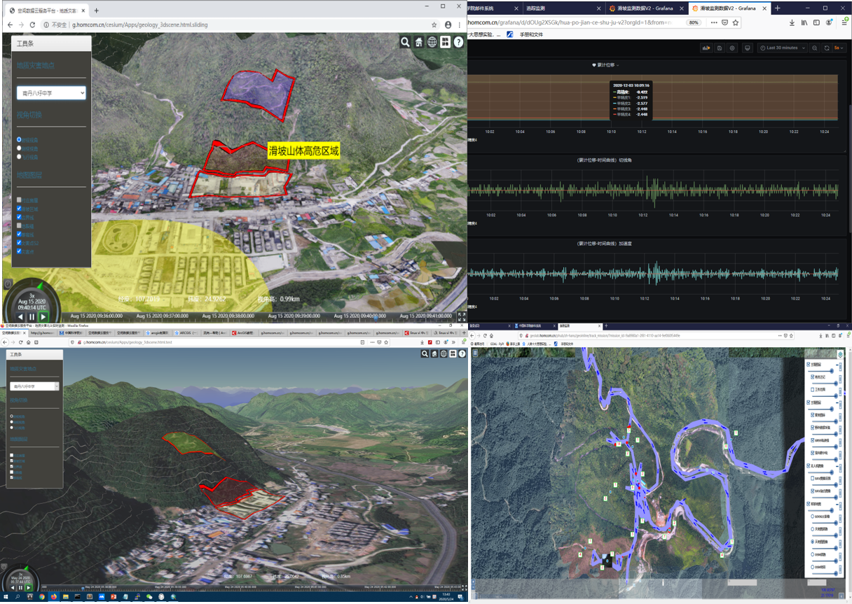 由于降雨、地震等自然因素或挖掘山坡坡脚等人为活动的影响,斜坡上土体或岩体的稳定性受到严重影响时,上部土体或岩体将会沿着下部含水的软弱面或软弱带顺坡下滑,引起滑坡地质灾害。以卫星精密定位技术为核心开发的土体或岩体形变监测硬件为基础设施,结合MQTT传感网、时空数据库、以及CESIUM GIS三维地图等软服务技术,实现对滑坡灾害点的形变测量、视频监测和预警。